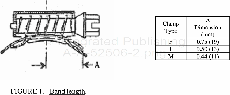 3.2.1 Band length. The maximum overlap band length at the maximum of the hose diameter for type F, I, and M clamps shall be as specified in Figure 1 and shall be verified when subjected to salient characteristic. Metric measurements are noted in parenthesis (millimeter).